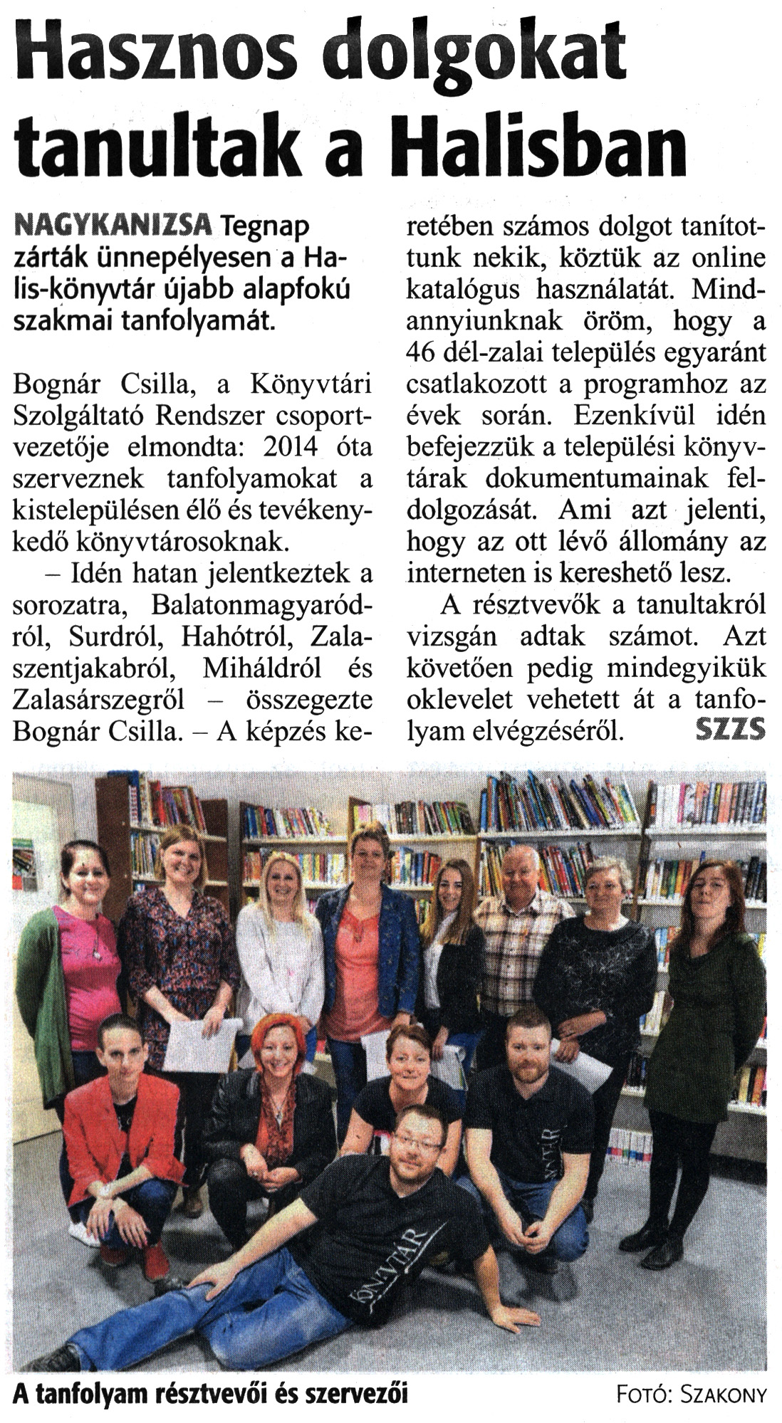 Nyilvános 1332 | 2551 | Zalai Hírlap 2019. április 10. 84. szám 3. oldal | Hasznos dolgokat tanultak a Halisban NAGYKANIZSA Tegnap zárták ünnepélyesen a Halis-könyvtár újabb alapfokú szakmai tanfolyamát. Bognár Csilla, a Könyvtári Szolgáltató Rendszer csoportvezetője elmondta: 2014 óta szerveznek tanfolyamokat a kistelepülésen élő és tevékenykedő könyvtárosoknak. - Idén hatan jelentkeztek a sorozatra, Balatonmagyaródról, Surdról, Hahótról, Zalaszentjakabról, Miháldról és Zalasárszegről - összegezte Bognár Csilla. - A képzés keretében számos dolgot tanítottunk nekik, köztük az online katalógus használatát. Mindannyiunknak öröm, hogy a 46 dél-zalai település egyaránt csatlakozott a programhoz az évek során. Ezenkívül idén befejezzük a települési könyvtárak dokumentumainak feldolgozását. Ami azt jelenti, hogy az ott lévő állomány az interneten is kereshető lesz. A résztvevők a tanultakról vizsgán adtak számot. Azt követően pedig mindegyikük oklevelet vehetett át a tanfolyam elvégzéséről. SZZS |