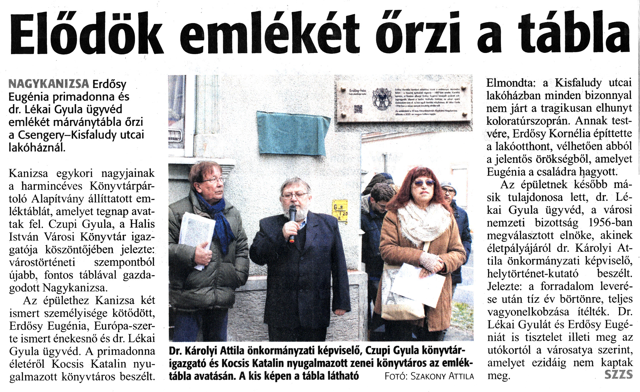 Nyilvános 1222 | 2263 | Zalai Hírlap 2020. január 23. 19. szám 3. oldal | Elődök emlékét őrzi a tábla NAGYKANIZSA Erdősy Eugénia primadonna és dr. Lékai Gyula ügyvéd emlékét márványtábla őrzi a Csengery-Kisfaludy utcai lakóháznál. Kanizsa egykori nagyjainak a harmincéves Könyvtárpártoló Alapítvány állíttatott emléktáblát, amelyet tegnap avattak fel. Czupi Gyula, a Halis István Városi Könyvtár igazgatója köszöntőjében jelezte: várostörténeti szempontból újabb, fontos táblával gazdagodott Nagykanizsa. Az épülethez Kanizsa két ismert személyisége kötődött, Erdősy Eugénia, Európa-szerte ismert énekesnő és dr. Lékai Gyula ügyvéd. A primadonna életéről Kocsis Katalin nyugalmazott könyvtáros beszélt. Elmondta: a Kisfaludy utcai lakóházban minden bizonnyal nem járt a tragikusan elhunyt koloratúrszoprán. Annak testvére, Erdősy Kornélia építtette a lakóotthont, vélhetően abból a jelentős örökségből, amelyet Eugénia a családra hagyott. Az épületnek később másik tulajdonosa lett, dr. Lékai Gyula ügyvéd, a városi nemzeti bizottság 1956-ban megválasztott elnöke, akinek életpályájáról dr. Károlyi Attila önkormányzati képviselő, helytörténet-kutató beszélt. Jelezte: a forradalom leverése után tíz év börtönre, teljes vagyonelkobzása ítélték. Dr. Lékai Gyulát és Erdősy Eugéniát is tisztelet illeti meg az utókortól a városatya szerint, amelyet ezidáig nem kaptak meg. SZZS Dr. Károlyi Attila önkormányzati képviselő, Czupi Gyula könyvtárigazgató és Kocsis Katalin nyugalmazott zenei könyvtáros az emléktábla avatásán. A kis képen a tábla látható Fotó: Szakony Attila |