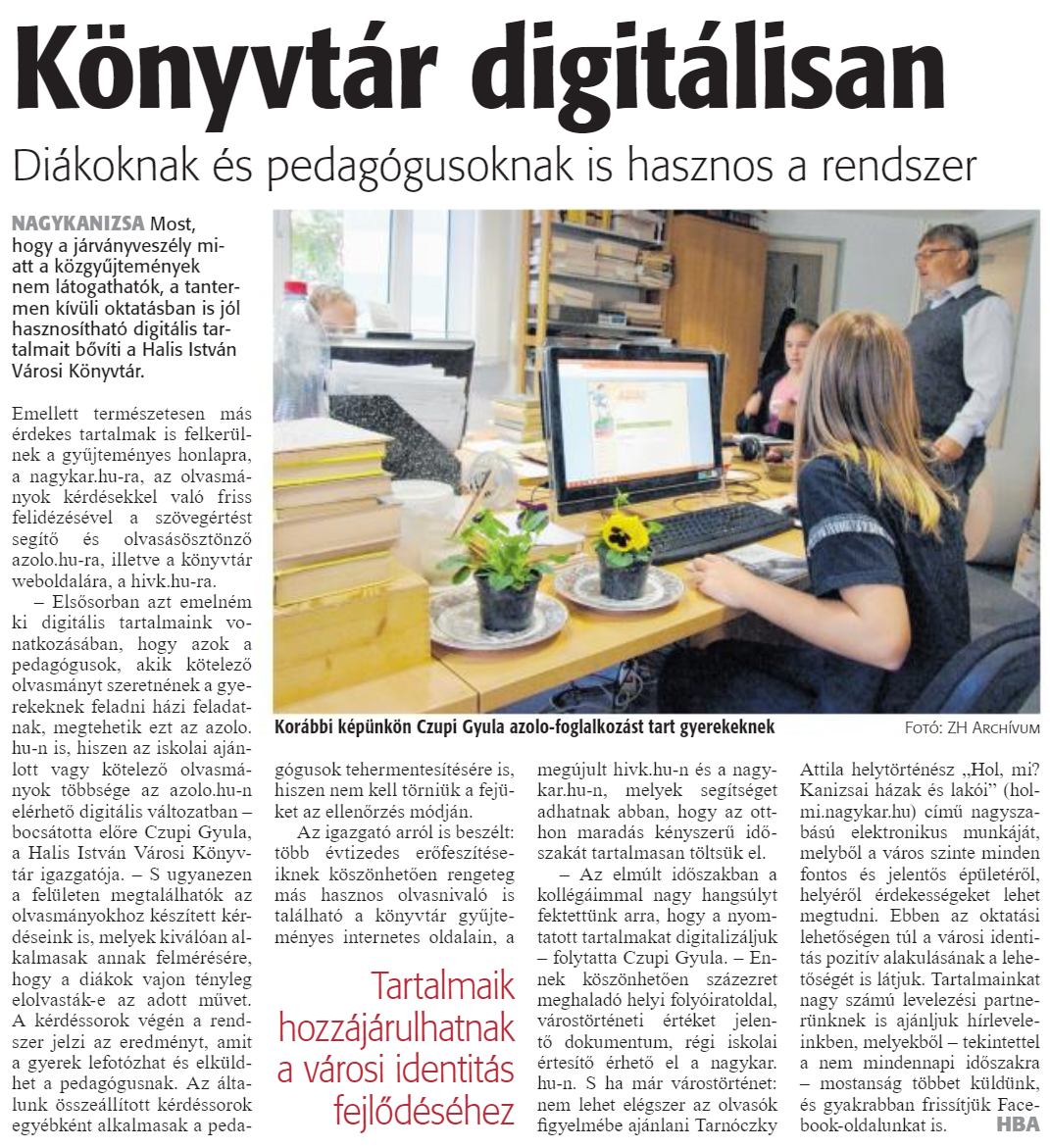 Nyilvános 1093 | 1708 | Könyvtár digitálisan | Diákoknak és pedagógusoknak is hasznos a rendszer Korábbi képünkön Czupi Gyula azolo-foglalkozást tart gyerekeknek Fotó: ZH Archívum NAGYKANIZSA Most, hogy a járványveszély miatt a közgyűjtemények nem látogathatók, a tantermen kívüli oktatásban is jól hasznosítható digitális tartalmait bővíti a Halis István Városi Könyvtár. Emellett természetesen más érdekes tartalmak is felkerülnek a gyűjteményes honlapra, a nagykar.hu-ra, az olvasmányok kérdésekkel való friss felidézésével a szövegértést segítő és olvasásösztönzö azolo.hu-ra, illetve a könyvtár weboldalára, a hivk.hu-ra. - Elsősorban azt emelném ki digitális tartalmaink vonatkozásában, hogy azok a pedagógusok, akik kötelező olvasmányt szeretnének a gyerekeknek feladni házi feladatnak, megtehetik ezt az azolo.hu-n is, hiszen az iskolai ajánlott vagy kötelező olvasmányok többsége az azolo.hu-n elérhető digitális változatban -bocsátotta előre Czupi Gyula, a Halis István Városi Könyvtár igazgatója. - S ugyanezen a felületen megtalálhatók az olvasmányokhoz készített kérdéseink is, melyek kiválóan alkalmasak annak felmérésére, hogy a diákok vajon tényleg elolvasták-e az adott művet. A kérdéssorok végén a rend-szer jelzi az eredményt, amit a gyerek lefotózhat és elküldhet a pedagógusnak. Az általunk összeállított kérdéssorok egyébként alkalmasak a pedagógusok tehermentesítésére is, hiszen nem kell törniük a fejüket az ellenőrzés módján. Az igazgató arról is beszélt: több évtizedes erőfeszítéseiknek köszönhetően rengeteg más hasznos olvasnivaló is található a könyvtár gyűjteményes internetes oldalain, a megújult hivk.hu-n és a nagykar.hu-n, melyek segítséget adhatnak abban, hogy az otthon maradás kényszerű időszakát tartalmasai! töltsük el. - Az elmúlt időszakban a kollégáimmal nagy hangsúlyt fektettünk arra, hogy a nyomtatott tartalmakat digitalizáljuk - folytatta Czupi Gyula. - Ennek köszönhetően százezret meghaladó helyi folyóiratoldal, várostörténeti értéket jelentő dokumentum, régi iskolai értesítő érhető el a nagykar.hu-n. S ha már várostörténet: nem lehet elégszer az olvasók figyelmébe ajánlani Tarnóczky Attila helytörténész "Hol, mi? Kanizsai házak és lakói" (hol-mi.nagykar.hu) című nagyszabású elektronikus munkáját, melyből a város szinte minden fontos és jelentős épületéről, helyéről érdekességeket lehet megtudni. Ebben az oktatási lehetőségen túl a városi identitás pozitív alakulásának a lehetőségét is látjuk. Tartalmainkat nagy számú levelezési partnerünknek is ajánljuk hírleveleinkben. melyekből - tekintettel a nem mindennapi időszakra - mostanság többet küldünk, és gyakrabban frissítjük Facebook-oldalunkat is. HBA |