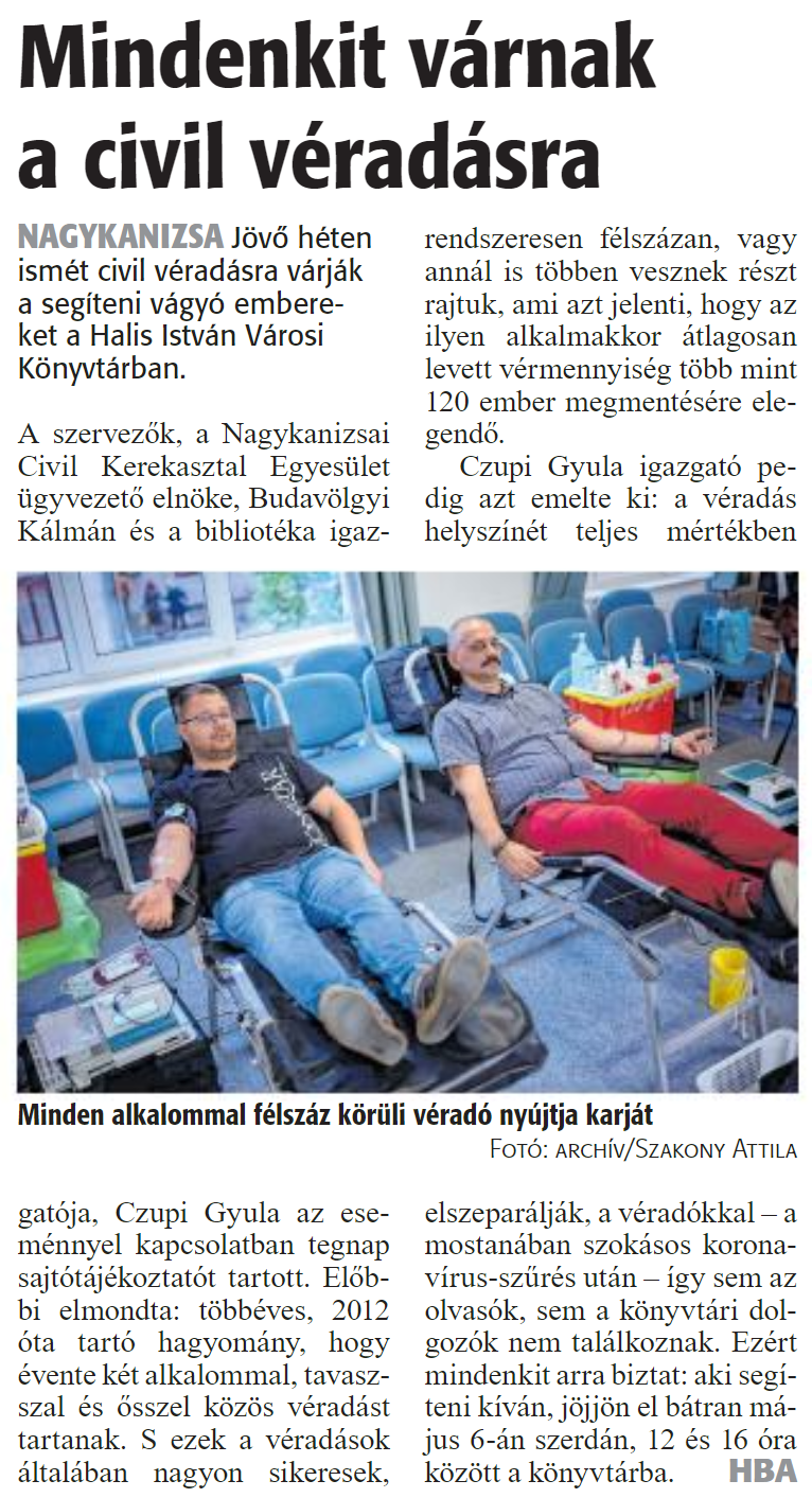 Nyilvános 1179 | 1993 | Zalai Hírlap 2020. április 29. 100. szám 3. oldal | Mindenkit várnak a civil véradásra NAGYKANIZSA Jövő héten ismét civil véradásra várják a segíteni vágyó embereket a Halis István Városi Könyvtárban. A szervezők, a Nagykanizsai Civil Kerekasztal Egyesület ügyvezető elnöke, Budavölgyi Kálmán és a bibliotéka igazgatója, Czupi Gyula az eseménnyel kapcsolatban tegnap sajtótájékoztatót tartott. Előbbi elmondta: többéves, 2012 óta tartó hagyomány, hogy évente két alkalommal, tavasszal és ősszel közös véradást tartanak. S ezek a véradások általában nagyon sikeresek, rendszeresen félszázán, vagy annál is többen vesznek részt rajtuk, ami azt jelenti, hogy az ilyen alkalmakkor átlagosan levett vérmennyiség több mint 120 ember megmentésére elegendő. Czupi Gyula igazgató pedig azt emelte ki: a véradás helyszínét teljes mértékben elszeparálják, a véradókkal - a mostanában szokásos koronavírus-szűrés után - így sem az olvasók, sem a könyvtári dolgozók nem találkoznak. Ezért mindenkit arra biztat: aki segíteni kíván, jöjjön el bátran május 6-án szerdán, 12 és 16 óra között a könyvtárba. HBA Minden alkalommal félszáz körüli véradó nyújtja karját Fotó: archív/Szakony Attila |