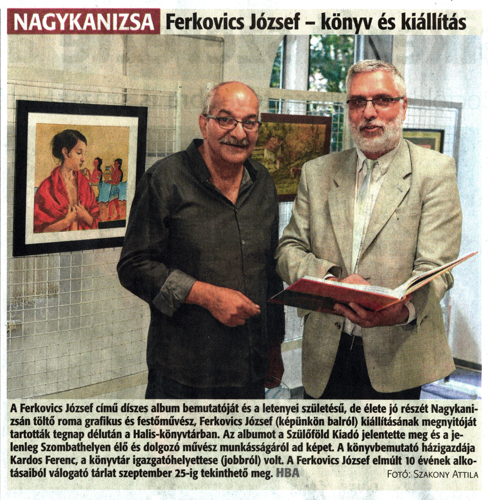 Nyilvános 1188 | 1947 | Zalai Hírlap 2020. szeptember 24. 224. szám 16. oldal - Ferkovics József - könyv és kiállítás | A Ferkovics József című díszes album bemutatóját és a letenyei születésű, de élete jó részét Nagykanizsán töltő roma grafikus és festőművész, Ferkovics József (képünkön balról) kiállításának megnyitóját tartották tegnap délután a Halis-könyvtárban. Az albumot a Szülőföld Kiadó jelentette meg és a jelenleg Szombathelyen élő és dolgozó művész munkásságáról ad képet. A könyvbemutató házigazdája Kardos Ferenc, a könyvtár igazgatóhelyettese (jobbról) volt. A Ferkovics József elmúlt 10 évének alkotásaiból válogató tárlat szeptember 25-ig tekinthető meg. HBA Fotó: Szakony Attila |