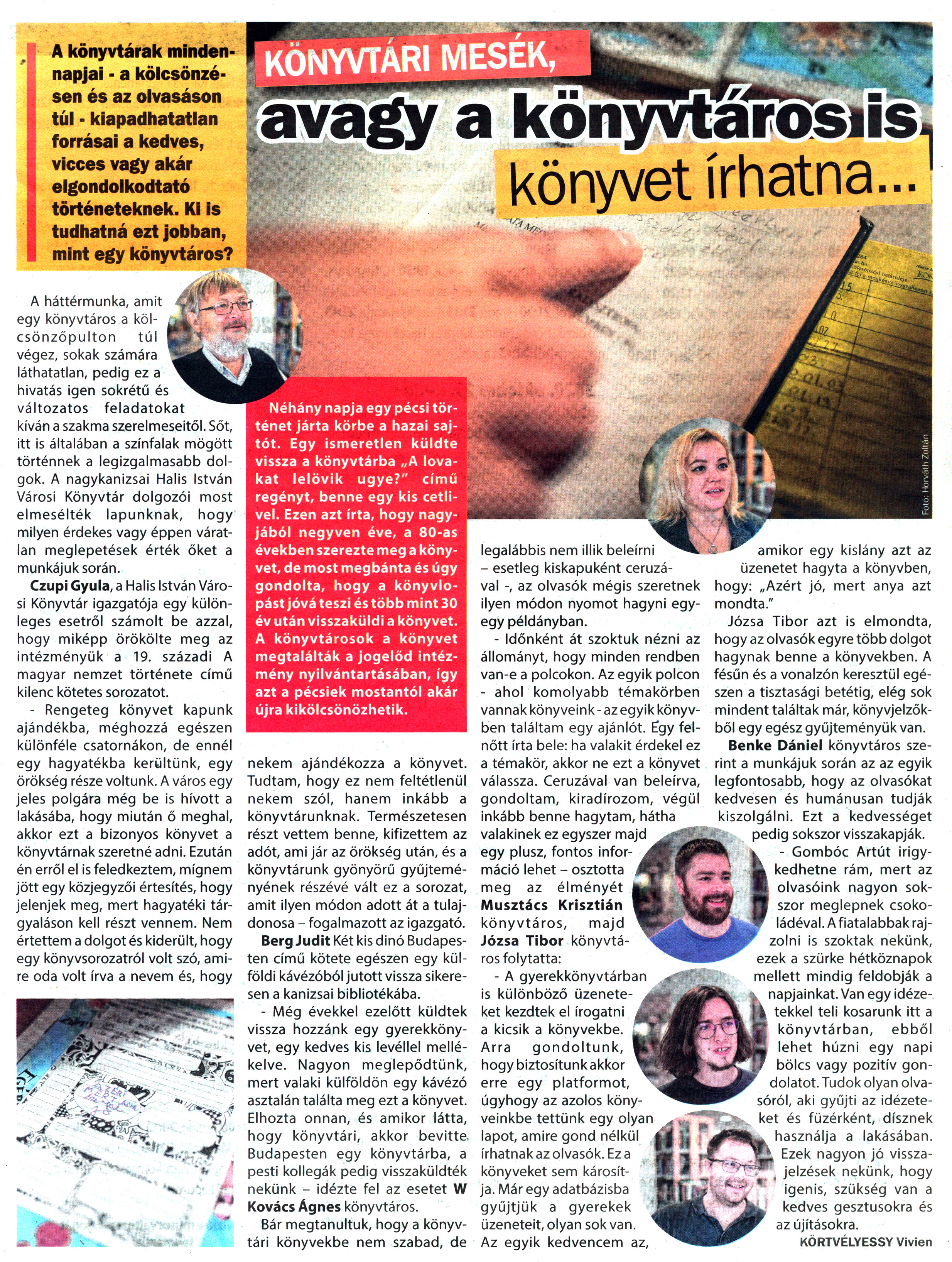 Nyilvános 1274 | 2139 | Kanizsa 2020. október 24. 38. szám 19old - Könyvtári mesék | KÖNYVTÁRI MESÉK, avagy a könyvtáros is könyvet írhatna... A könyvtárak mindennapjai - a kölcsönzésen és az olvasáson túl - kiapadhatatlan forrásai a kedves, vicces vagy akár elgondolkodtató történeteknek. Ki is tudhatná ezt jobban, mint egy könyvtáros? Nehany napja egy pécsi történet járta körbe a hazai sajtót. Egy ismeretlen küldte vissza a könyvtárba „A lovakat lelövik ugye?" című regényt, benne egy kis cetlivel. Ezen azt írta, hogy nagyjából negyven éve, a 80-as években szerezte meg a könyvet, de most megbánta és úgy gondolta, hogy a könyvlopást jóvá teszi és több mint 30 év után visszaküldi a könyvet. A könyvtárosok a könyvet megtalálták a jogelőd intézmény nyilvántartásában, így azt a pécsiek mostantól akár újra kikölcsönözhetik. A háttérmunka, amit egy könyvtáros a kölcsönzőpulton túl végez, sokak számára láthatatlan, pedig ez a hivatás igen sokrétű és változatos feladatokat kíván a szakma szerelmeseitől. Sőt, itt is általában a színfalak mögött történnek a legizgalmasabb dolgok. A nagykanizsai Halis István Városi Könyvtár dolgozói most elmesélték lapunknak, hogy milyen érdekes vagy éppen váratlan meglepetések érték őket a munkájuk során. Czupi Gyula, a Halis István Városi Könyvtár igazgatója egy különleges esetről számolt be azzal, hogy miképp örökölte meg az intézményük a 19. századi A magyar nemzet története című kilenc kötetes sorozatot. - Rengeteg könyvet kapunk ajándékba, méghozzá egészen különféle csatornákon, de ennél egy hagyatékba kerültünk, egy örökség része voltunk. A város egy jeles polgára még be is hívott a lakásába, hogy miután ő meghal, akkor ezt a bizonyos könyvet a könyvtárnak szeretné adni. Ezután én erről el is feledkeztem, mígnem jött egy közjegyzői értesítés, hogy jelenjek meg, mert hagyatéki tárgyaláson kell részt vennem. Nem értettem a dolgot és kiderült, hogy egy könyvsorozatról volt szó, amire oda volt írva a nevem és, hogy nekem ajándékozza a könyvet. Tudtam, hogy ez nem feltétlenül nekem szól, hanem inkább a könyvtárunknak. Természetesen részt vettem benne, kifizettem az adót, ami jár az örökség után, és a könyvtárunk gyönyörű gyűjteményének részévé vált ez a sorozat, amit ilyen módon adott át a tulajdonosa - fogalmazott az igazgató. Berg Judit Két kis dinó Budapesten című kötete egészen egy külföldi kávézóból jutott vissza sikeresen a kanizsai bibliotékába. - Még évekkel ezelőtt küldtek vissza hozzánk egy gyerekkönyvet, egy kedves kis levéllel mellékelve. Nagyon meglepődtünk, mert valaki külföldön egy kávézó asztalán találta meg ezt a könyvet. Elhozta onnan, és amikor látta, hogy könyvtári, akkor bevitte Budapesten egy könyvtárba, a pesti kollegák pedig visszaküldték nekünk - idézte fel az esetet W Kovács Ágnes könyvtáros. Bár megtanultuk, hogy a könyvtári könyvekbe nem szabad, de legalábbis nem illik beleírni - esetleg kiskapuként ceruzával -, az olvasók mégis szeretnek ilyen módon nyomot hagyni egy-egy példányban. - Időnként át szoktuk nézni az állományt, hogy minden rendben van-e a polcokon. Az egyik polcon - ahol komolyabb témakörben vannak könyveink - az egyik könyvben találtam egy ajánlót. Egy felnőtt írta bele: ha valakit érdekel ez a témakör, akkor ne ezt a könyvet válassza. Ceruzával van beleírva, gondoltam, kiradírozom, végül inkább benne hagytam, hátha valakinek ez egyszer majd egy plusz, fontos információ lehet - osztotta meg az élményét Musztács Krisztián könyvtáros, majd Józsa Tibor könyvtáros folytatta: - A gyerekkönyvtárban is különböző üzeneteket kezdtek el írogatni a kicsik a könyvekbe. Arra gondoltunk, hogy biztosítunk akkor erre egy platformot, úgyhogy az azolos könyveinkbe tettünk egy olyan lapot, amire gond nélkül írhatnak az olvasók. Ez a könyveket sem károsítja. Már egy adatbázisba gyűjtjük a gyerekek üzeneteit, olyan sok van. Az egyik kedvencem az, amikor egy kislány azt az üzenetet hagyta a könyvben, hogy: „Azért jó, mert anya azt mondta." Józsa Tibor azt is elmondta, hogy az olvasók egyre több dolgot hagynak benne a könyvekben. A fésűn és a vonalzón keresztül egészen a tisztasági betétig, elég sok mindent találtak már, könyvjelzőkből egy egész gyűjteményük van. Benke Dániel könyvtáros szerint a munkájuk során az az egyik legfontosabb, hogy az olvasókat kedvesen és humánusan tudják kiszolgálni. Ezt a kedvességet pedig sokszor visszakapják. - Gombóc Artút irigykedhetne rám, mert az olvasóink nagyon sokszor meglepnek csokoládéval. A fiatalabbak rajzolni is szoktak nekünk, ezek a szürke hétköznapok mellett mindig feldobják a napjainkat. Van egy idézetekkel teli kosarunk itt a könyvtárban, ebből lehet húzni egy napi bölcs vagy pozitív gondolatot. Tudok olyan olvasóról, aki gyűjti az idézeteket és füzérként, dísznek használja a lakásában. Ezek nagyon jó visszajelzések nekünk, hogy igenis, szükség van a kedves gesztusokra és az újításokra. KÖRTVÉLYESSY Vivien |