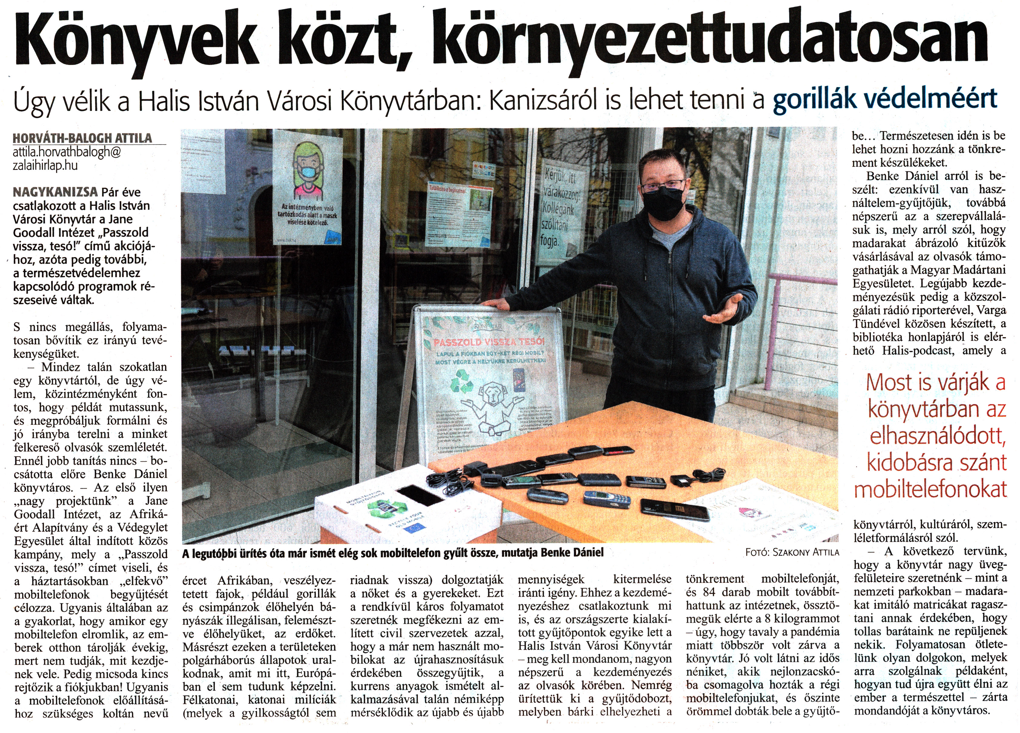 Nyilvános 1068 | 1518 | Zalai Hírlap 2021. február 8. 32. szám 4. oldal | Könyvek közt, környezettudatosan NAGYKANIZSA Pár éve csatlakozott a Halis István Városi Könyvtár a Jane Goodall Intézet „Passzold vissza, tesó!" című akciójához, azóta pedig további, a természetvédelemhez kapcsolódó programok részeseivé váltak. S nincs megállás, folyamatosan bővítik ez irányú tevékenységüket. - Mindez talán szokatlan egy könyvtártól, de úgy vélem, közintézményként fontos, hogy példát mutassunk, és megpróbáljuk formálni és jó irányba terelni a minket felkereső olvasók szemléletét. Ennél jobb tanítás nincs - bocsátotta előre Benke Dániel könyvtáros. - Az első ilyen „nagy projektünk" a Jane Goodall Intézet, az Afrikáért Alapítvány és a Védegylet Egyesület által indított közös kampány, mely a „Passzold vissza, tesó!" címet viseli, és a háztartásokban „elfekvő" mobiltelefonok begyűjtését célozza. Ugyanis általában az a gyakorlat, hogy amikor egy mobiltelefon elromlik, az emberek otthon tárolják évekig, mert nem tudják, mit kezdjenek vele. Pedig micsoda kincs rejtőzik a fiókjukban! Ugyanis a mobiltelefonok előállításához szükséges koltán nevű ércet Afrikában, veszélyeztetett fajok, például gorillák és csimpánzok élőhelyén bányásszák illegálisan, felemésztve élőhelyüket, az erdőket. Másrészt ezeken a területeken polgárháborús állapotok uralkodnak, amit mi itt, Európában el sem tudunk képzelni. Félkatonai, katonai milíciák (melyek a gyilkosságtól sem riadnak vissza) dolgoztatják a nőket és a gyerekeket. Ezt a rendkívül káros folyamatot szeretnék megfékezni az említett civil szervezetek azzal, hogy a már nem használt mobilokat az újrahasznosításuk érdekében összegyűjtik, a kurrens anyagok ismételt alkalmazásával talán némiképp mérséklődik az újabb és újabb mennyiségek kitermelése iránti igény. Ehhez a kezdeményezéshez csatlakoztunk mi is, és az országszerte kialakított gyűjtőpontok egyike lett a Halis István Városi Könyvtár - meg kell mondanom, nagyon népszerű a kezdeményezés az olvasók körében. Nemrég ürítettük ki a gyüjtődobozt, melyben bárki elhelyezheti a tönkrement mobiltelefonját, és 84 darab mobilt továbbíthattunk az intézetnek, össztömegük elérte a 8 kilogrammot - úgy, hogy tavaly a pandémia miatt többször volt zárva a könyvtár. Jó volt látni az idős néniket, akik nejlonzacskóba csomagolva hozták a régi mobiltelefonjukat, és őszinte örömmel dobták bele a gyűjtőbe... Természetesen idén is be lehet hozni hozzánk a tönkrement készülékeket. Benke Dániel arról is beszélt: ezenkívül van használtelem-gyüjtőjük, továbbá népszerű az a szerepvállalásuk is, mely arról szól, hogy madarakat ábrázoló kitűzők vásárlásával az olvasók támogathatják a Magyar Madártani Egyesületet. Legújabb kezdeményezésük pedig a közszolgálati rádió riporterével, Varga Tündével közösen készített, a bibliotéka honlapjáról is elérhető Halis-podcast, amely a könyvtárról, kultúráról, szemléletformálásról szól. - A következő tervünk, hogy a könyvtár nagy üvegfelületeire szeretnénk - mint a nemzeti parkokban - madarakat imitáló matricákat ragasztani annak érdekében, hogy tollas barátaink ne repüljenek nekik. Folyamatosan ötletelünk olyan dolgokon, melyek arra szolgálnak példaként, hogyan tud újra együtt élni az ember a természettel - zárta mondandóját a könyvtáros. HORVÁTH-BALOGH ATTILA attila.horvathbalogh@ zalaihirlap.hu |