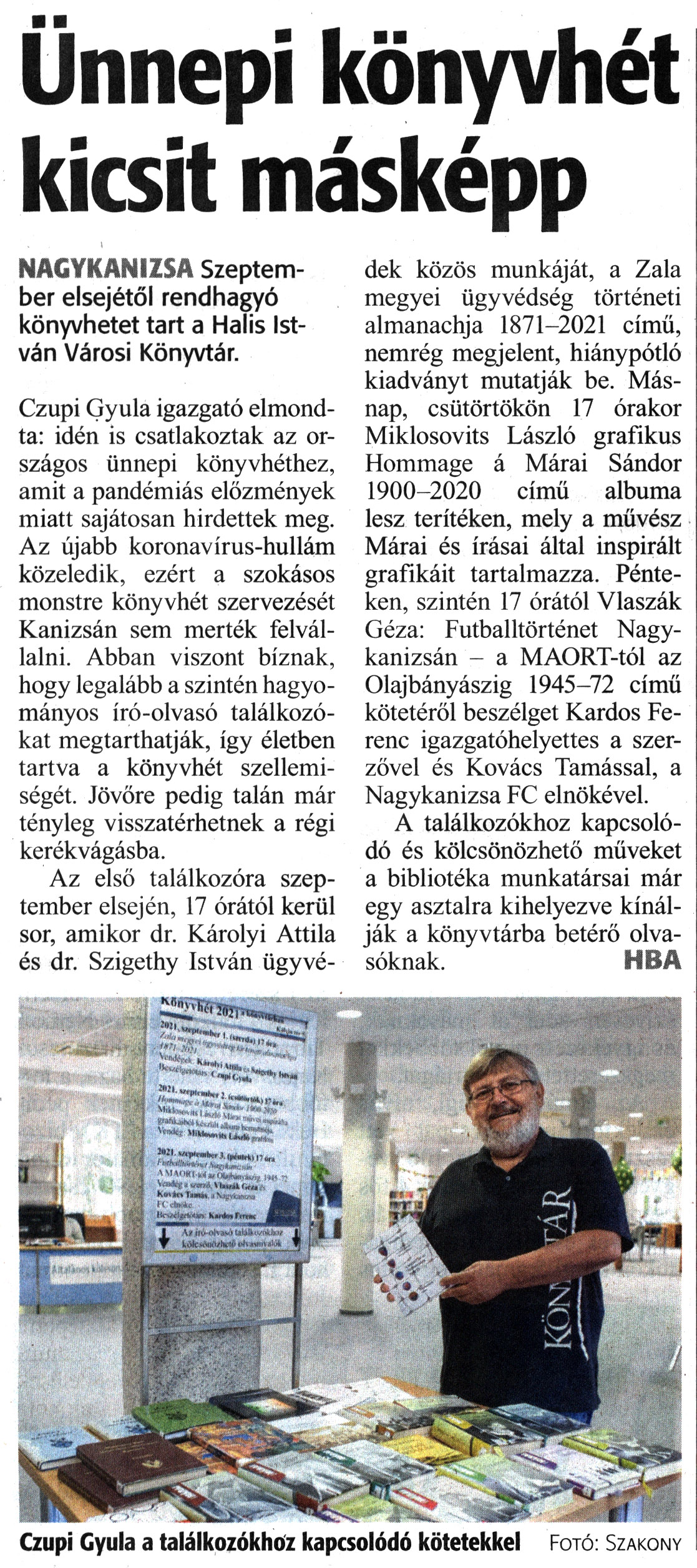 Nyilvános 945 | 1353 | Zalai Hírlap 2021. augusztus 27. 198. szám 3. oldal | Ünnepi könyvhét kicsit másképp NAGYKANIZSA Szeptember elsejétől rendhagyó könyvhetet tart a Halis István Városi Könyvtár. Czupi Gyula igazgató elmondta: idén is csatlakoztak az országos ünnepi könyvhéthez, amit a pandémiás előzmények miatt sajátosan hirdettek meg. Az újabb koronavírus-hullám közeledik, ezért a szokásos monstre könyvhét szervezését Kanizsán sem merték felvállalni. Abban viszont bíznak, hogy legalább a szintén hagyományos író-olvasó találkozókat megtarthatják, így életben tartva a könyvhét szellemiségét. Jövőre pedig talán már tényleg visszatérhetnek a régi kerékvágásba. Az első találkozóra szeptember elsején, 17 órától kerül sor, amikor dr. Károlyi Attila és dr. Szigethy István ügyvédek közös munkáját, a Zala megyei ügyvédség történeti almanachja 1871-2021 című, nemrég megjelent, hiánypótló kiadványt mutatják be. Másnap, csütörtökön 17 órakor Miklosovits László grafikus Hommage á Márai Sándor 1900-2020 című albuma lesz terítéken, mely a művész Márai és írásai által inspirált grafikáit tartalmazza. Pénteken, szintén 17 órától Vlaszák Géza: Futballtörténet Nagykanizsán - a MAORT-tól az Olajbányászig 1945-72 című kötetéről beszélget Kardos Ferenc igazgatóhelyettes a szerzővel és Kovács Tamással, a Nagykanizsa FC elnökével. A találkozókhoz kapcsolódó és kölcsönözhető műveket a bibliotéka munkatársai már egy asztalra kihelyezve kínálják a könyvtárba betérő olvasóknak. HBA Czupi Gyula a találkozókhoz kapcsolódó kötetekkel Fotó: Szakony |