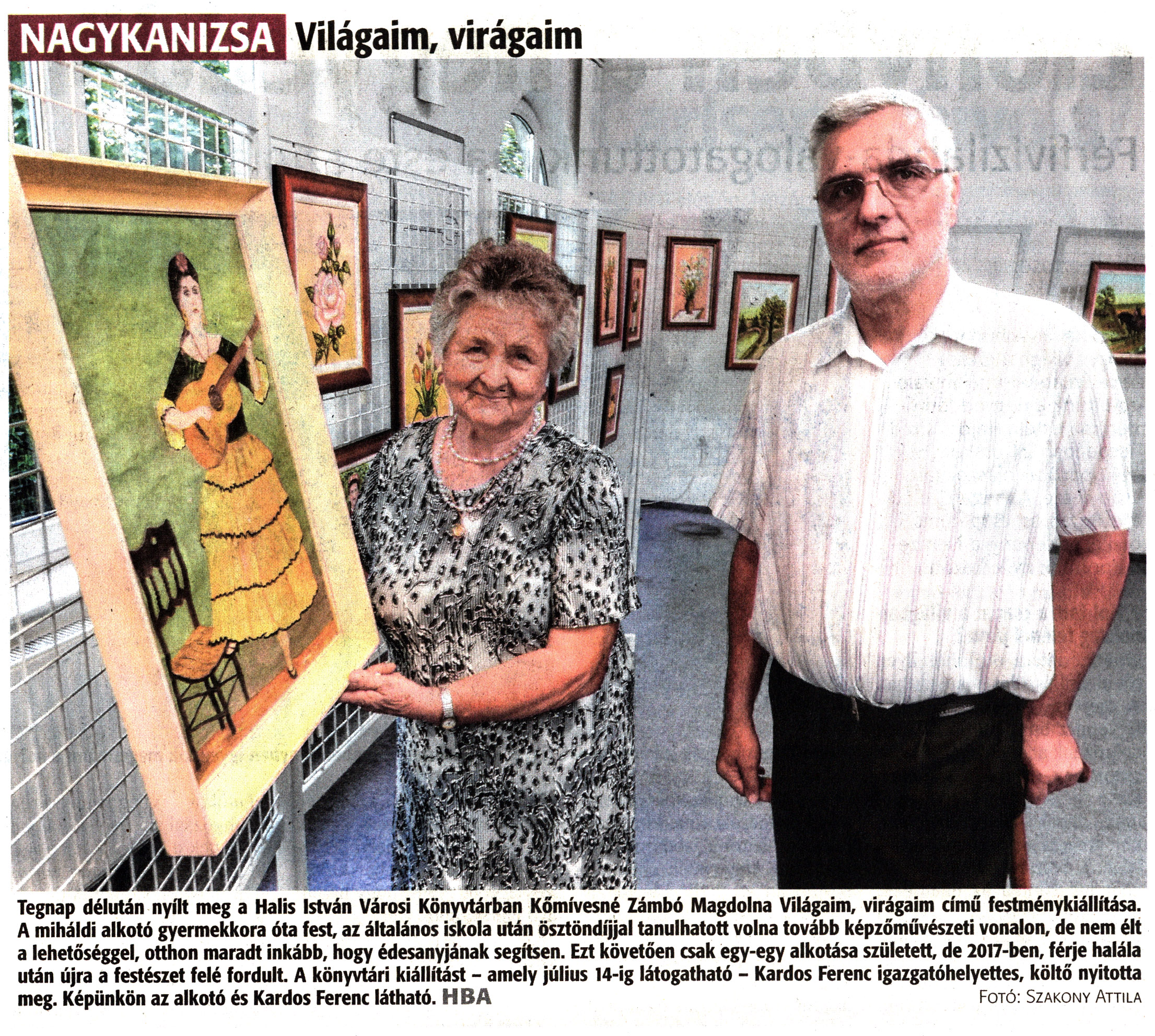 Nyilvános 886 | 1223 | Zalai Hírlap 2022. június 29. 149. szám 16. oldal | NAGYKANIZSA Világaim, virágaim Tegnap délután nyílt meg a Halis István Városi Könyvtárban Kőmívesné Zámbó Magdolna Világaim, virágaim című festménykiállítása. A miháldi alkotó gyermekkora óta fest, az általános iskola után ösztöndíjjal tanulhatott volna tovább képzőművészeti vonalon, de nem élt a lehetőséggel, otthon maradt inkább, hogy édesanyjának segítsen. Ezt követően csak egy-egy alkotása született, de 2017-ben, férje halála után újra a festészet felé fordult. A könyvtári kiállítást - amely július 14-ig látogatható - Kardos Ferenc igazgatóhelyettes, költő nyitotta meg. Képünkön az alkotó és Kardos Ferenc látható. HBA Fotó: Szakony Attila |