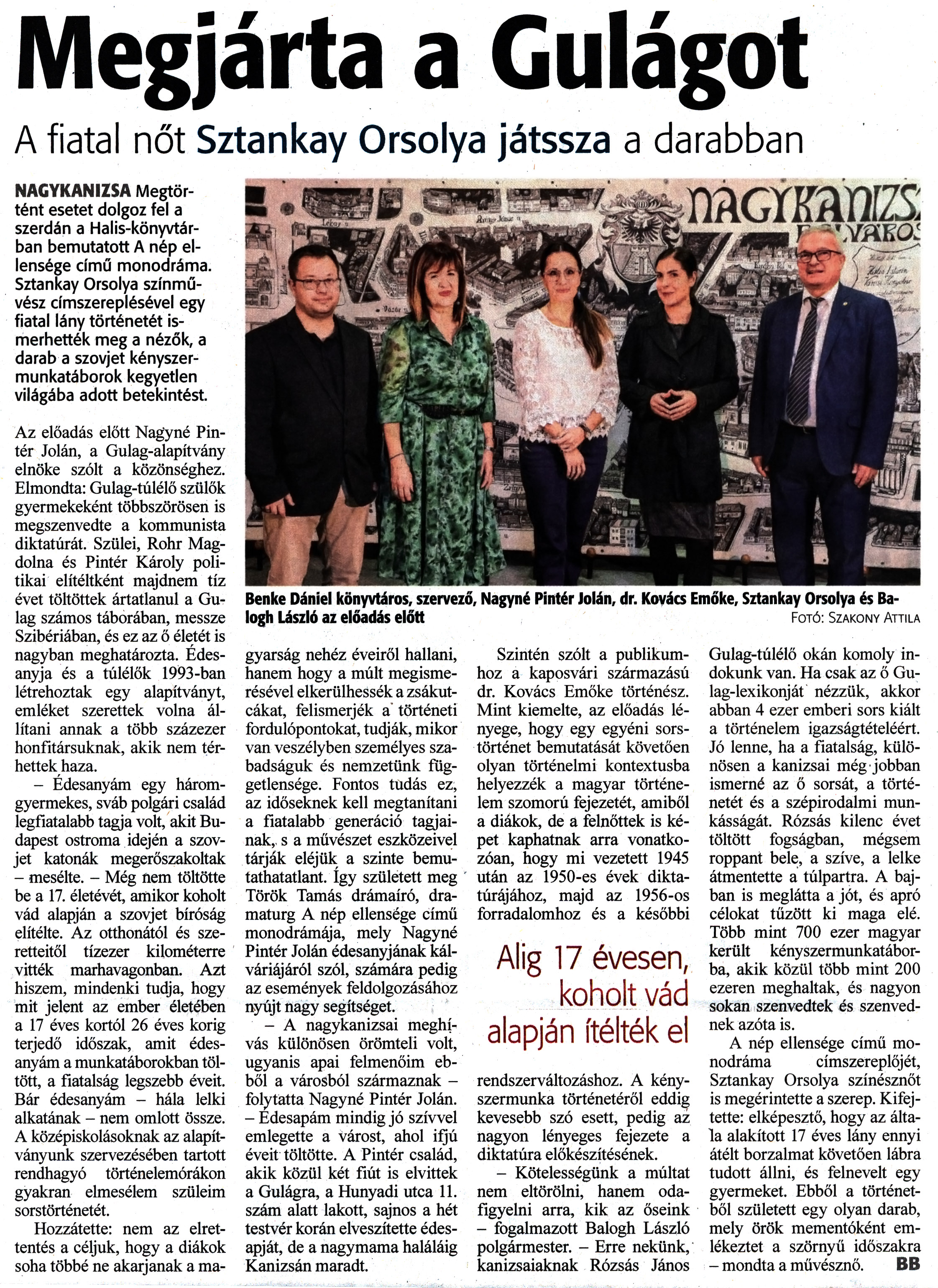 Nyilvános 894 | 1316 | Zalai Hírlap 2022. november 11. 263. szám 13. oldal | Megjárta a Gulágot A fiatal nőt Sztankay Orsolya játssza a darabban NAGYKANIZSA Megtörtént esetet dolgoz fel a szerdán a Halis-könyvtárban bemutatott A nép ellensége című monodráma. Sztankay Orsolya színművész címszereplésével egy fiatal lány történetét ismerhették meg a nézők, a darab a szovjet kényszermunkatáborok kegyetlen világába adott betekintést. Az előadás előtt Nagyné Pintér Jolán, a Gulag-alapítvány elnöke szólt a közönséghez. Elmondta: Gulag-túlélő szülők gyermekeként többszörösen is megszenvedte a kommunista diktatúrát. Szülei, Rohr Magdolna és Pintér Károly politikai elítéltként majdnem tíz évet töltöttek ártatlanul a Gulag számos táborában, messze Szibériában, és ez az ő életét is nagyban meghatározta. Édesanyja és a túlélők 1993-ban létrehoztak egy alapítványt, emléket szerettek volna állítani annak a több százezer honfitársuknak, akik nem térhettek haza. - Édesanyám egy háromgyermekes, sváb polgári család legfiatalabb tagja volt, akit Budapest ostroma idején a szovjet katonák megerőszakoltak - mesélte. - Még nem töltötte be a 17. életévét, amikor koholt vád alapján a szovjet bíróság elítélte. Az otthonától és szeretteitől tízezer kilométerre vitték marhavagonban. Azt hiszem, mindenki tudja, hogy mit jelent az ember életében a 17 éves kortól 26 éves korig terjedő időszak, amit édesanyám a munkatáborokban töltött, a fiatalság legszebb éveit. Bár édesanyám - hála lelki alkatának - nem omlott össze. A középiskolásoknak az alapítványunk szervezésében tartott rendhagyó történelemórákon gyakran elmesélem szüleim sorstörténetét. Hozzátette: nem az elrettentés a céljuk, hogy a diákok soha többé ne akarjanak a magyarság nehéz éveiről hallani, hanem hogy a múlt megismerésével elkerülhessék a zsákutcákat, felismerjék a történeti fordulópontokat, tudják, mikor van veszélyben személyes szabadságuk és nemzetünk függetlensége. Fontos tudás ez, az időseknek kell megtanítani a fiatalabb generáció tagjainak, s a művészet eszközeivel tárják eléjük a szinte bemutathatatlant. Így született meg Török Tamás drámaíró, dramaturg A nép ellensége című monodrámája, mely Nagyné Pintér Jolán édesanyjának kálváriájáról szól, számára pedig az események feldolgozásához nyújt nagy segítséget. - A nagykanizsai meghívás különösen örömteli volt, ugyanis apai felmenőim ebből a városból származnak - folytatta Nagyné Pintér Jolán. - Édesapám mindig jó szívvel emlegette a várost, ahol ifjú éveit töltötte. A Pintér család, akik közül két fiút is elvittek a Gulágra, a Hunyadi utca 11. szám alatt lakott, sajnos a hét testvér korán elveszítette édesapját, de a nagymama haláláig Kanizsán maradt. Szintén szólt a publikumhoz a kaposvári származású dr. Kovács Emőke történész. Mint kiemelte, az előadás lényege, hogy egy egyéni sorstörténet bemutatását követően olyan történelmi kontextusba helyezzék a magyar történelem szomorú fejezetét, amiből a diákok, de a felnőttek is képet kaphatnak arra vonatkozóan, hogy mi vezetett 1945 után az 1950-es évek diktatúrájához, majd az 1956-os forradalomhoz és a későbbi rendszerváltozáshoz. A kényszermunka történetéről eddig kevesebb szó esett, pedig az nagyon lényeges fejezete a diktatúra előkészítésének. - Kötelességünk a múltat nem eltörölni, hanem odafigyelni arra, kik az őseink - fogalmazott Balogh László polgármester. - Erre nekünk, kanizsaiaknak Rózsás János Gulag-túlélő okán komoly indokunk van. Ha csak az ő Gulag-lexikonját nézzük, akkor abban 4 ezer emberi sors kiált a történelem igazságtételéért. Jó lenne, ha a fiatalság, különösen a kanizsai még jobban ismerné az ő sorsát, a történetét és a szépirodalmi munkásságát. Rózsás kilenc évet töltött fogságban, mégsem roppant bele, a szíve, a lelke átmentette a túlpartra. A bajban is meglátta a jót, és apró célokat tűzött ki maga elé. Több mint 700 ezer magyar került kényszermunkatáborba, akik közül több mint 200 ezren meghaltak, és nagyon sokan szenvedtek és szenvednek azóta is. A nép ellensége című monodráma címszereplőjét, Sztankay Orsolya színésznőt is megérintette a szerep. Kifejtette: elképesztő, hogy az általa alakított 17 éves lány ennyi átélt borzalmat követően lábra tudott állni, és felnevelt egy gyermeket. Ebből a történetből született egy olyan darab, mely örök mementóként emlékeztet a szörnyű időszakra - mondta a művésznő. BB Benke Dániel könyvtáros, szervező, Nagyné Pintér Jolán, dr. Kovács Emőke, Sztankay Orsolya és Balogh László az előadás előtt Fotó: Szakony Attila |