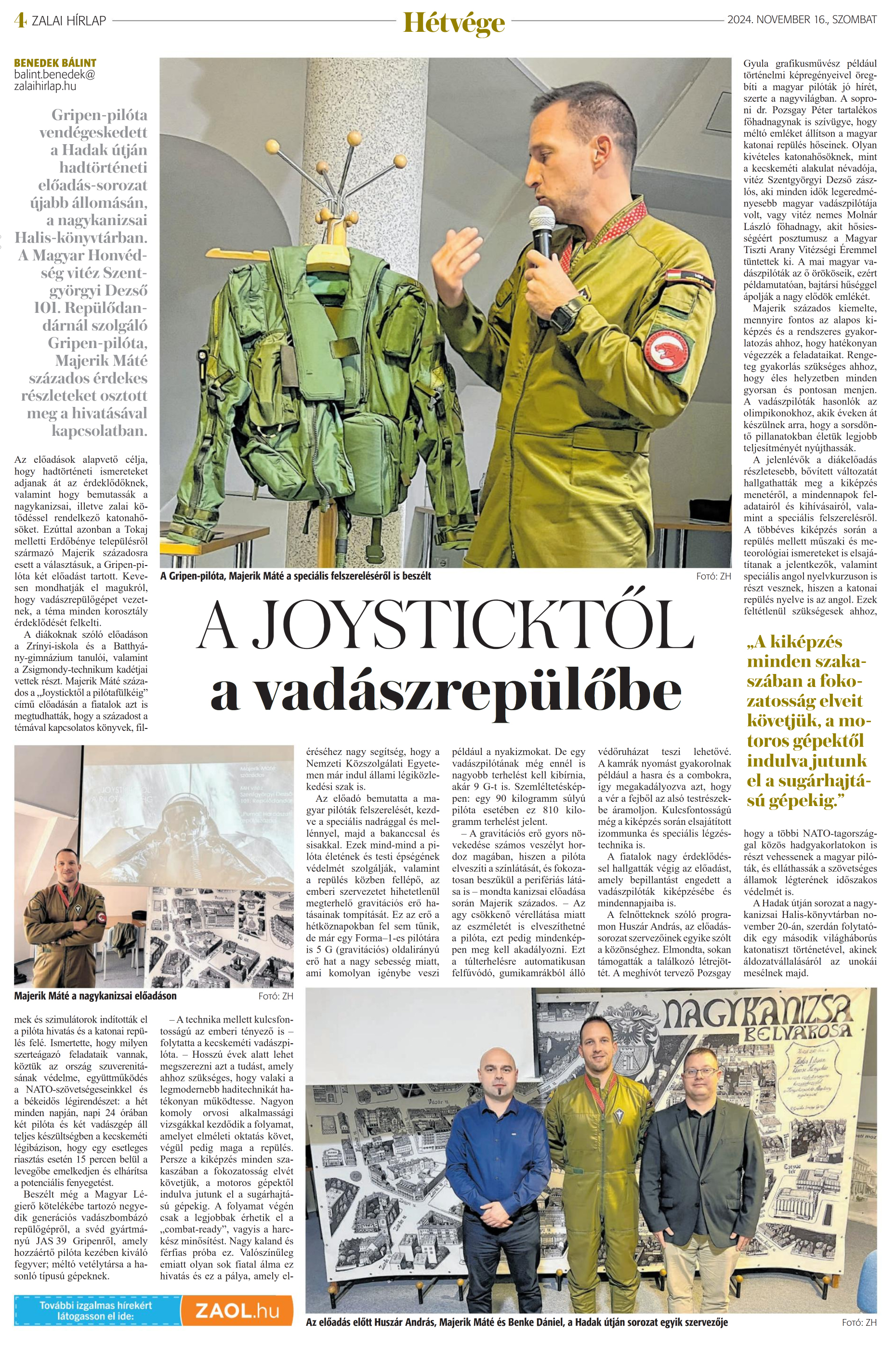 Nyilvános 644 | 725 | Zalai Hírlap 2024. november 16. 267. szám 4. oldal | A JOYSTICKTŐL a vadászrepülőbe BENEDEK BÁLINT balint.benedek@ zalaihirlap.hu Gripen-pilóta vendégeskedett a Hadak útján hadtörténeti előadás-sorozat ujabb állomásán, a nagykanizsai Halis-könyvtárban. A Magyar Honvédség vitéz Szent-györgyi Dezső 101. Repülődandárnál szolgáló Gripen-pilóta, Majerik Máté százados érdekes részleteket osztott meg a hivatásával kapcsolatban. Az előadások alapvető célja, hogy hadtörténeti ismereteket adjanak át az érdeklődőknek, valamint hogy bemutassák a nagykanizsai, illetve zalai kötődéssel rendelkező katonahősöket. Ezúttal azonban a Tokaj melletti Erdőbénye településről származó Majerik századosra esett a választásuk, a Gripen-pilóta két előadást tartott. Kevesen mondhatják el magukról, hogy vadászrepülőgépet vezetnek, a téma minden korosztály érdeklődését felkelti. A diákoknak szóló előadáson a Zrínyi-iskola és a Batthyány-gimnázium tanulói, valamint a Zsigmondy-technikum kadétjai vettek részt. Majerik Máté százados a „Joysticktől a pilótafülkéig" című előadásán a fiatalok azt is megtudhatták, hogy a századost a témával kapcsolatos könyvek, filmek és szimulátorok indították el a pilóta hivatás és a katonai repülés felé. Ismertette, hogy milyen szerteágazó feladataik vannak, köztük az ország szuverenitásának védelme, együttműködés a NATO-szövetségeseinkkel és a békeidős légirendészet: a hét minden napján, napi 24 órában két pilóta és két vadászgép áll teljes készültségben a kecskeméti légibázison, hogy egy esetleges riasztás esetén 15 percen belül a levegőbe emelkedjen és elhárítsa a potenciális fenyegetést. Beszélt még a Magyar Légierő kötelékébe tartozó negyedik generációs vadászbombázó repülőgépről, a svéd gyártmányú JAS 39 Gripenről, amely hozzáértő pilóta kezében kiváló fegyver; méltó vetélytársa a hasonló típusú gépeknek. -A technika mellett kulcsfontosságú az emberi tényező is - folytatta a kecskeméti vadászpilóta. - Hosszú évek alatt lehet megszerezni azt a tudást, amely ahhoz szükséges, hogy valaki a legmodernebb haditechnikát hatékonyan működtesse. Nagyon komoly orvosi alkalmassági vizsgákkal kezdődik a folyamat, amelyet elméleti oktatás követ, végül pedig maga a repülés. Persze a kiképzés minden szakaszában a fokozatosság elvét követjük, a motoros gépektől indulva jutunk el a sugárhajtású gépekig. A folyamat végén csak a legjobbak érhetik el a „combat-ready", vagyis a harckész minősítést. Nagy kaland és férfias próba ez. Valószínűleg emiatt olyan sok fiatal álma ez hivatás és ez a pálya, amely eléréséhez nagy segítség, hogy a Nemzeti Közszolgálati Egyetemen már indul állami légiközlekedési szak is. Az előadó bemutatta a magyar pilóták felszerelését, kezdve a speciális nadrággal és mellénnyel, majd a bakanccsal és sisakkal. Ezek mind-mind a pilóta életének és testi épségének védelmét szolgálják, valamint a repülés közben fellépő, az emberi szervezetet hihetetlenül megterhelő gravitációs erő hatásainak tompítását. Ez az erő a hétköznapokban fel sem tűnik, de már egy Forma-l-es pilótára is 5 G (gravitációs) oldalirányú erő hat a nagy sebesség miatt, ami komolyan igénybe veszi például a nyakizmokat. De egy vadászpilótának még ennél is nagyobb terhelést kell kibírnia, akár 9 G-t is. Szemléltetésképpen: egy 90 kilogramm súlyú pilóta esetében ez 810 kilogramm terhelést jelent. - A gravitációs erő gyors növekedése számos veszélyt hordoz magában, hiszen a pilóta elveszíti a színlátását, és fokozatosan beszűkül a perifériás látása is - mondta kanizsai előadása során Majerik százados. - Az agy csökkenő vérellátása miatt az eszméletét is elveszíthetné a pilóta, ezt pedig mindenképpen meg kell akadályozni. Ezt a túlterhelésre automatikusan felfúvódó, gumikamrákból álló védőruházat teszi lehetővé. A kamrák nyomást gyakorolnak például a hasra és a combokra, így megakadályozva azt, hogy a vér a fejből az alsó testrészekbe áramoljon. Kulcsfontosságú még a kiképzés során elsajátított izommunka és speciális légzéstechnika is. A fiatalok nagy érdeklődéssel hallgatták végig az előadást, amely bepillantást engedett a vadászpilóták kiképzésébe és mindennapjaiba is. A felnőtteknek szóló programon Huszár András, az előadássorozat szervezőinek egyike szólt a közönséghez. Elmondta, sokan támogatták a találkozó létrejöttét. A meghívót tervező Pozsgay Gyula grafikusművész például történelmi képregényeivel öregbíti a magyar pilóták jó hírét, szerte a nagyvilágban. A soproni dr. Pozsgay Péter tartalékos főhadnagynak is szívügye, hogy méltó emléket állítson a magyar katonai repülés hőseinek. Olyan kivételes katonahősöknek, mint a kecskeméti alakulat névadója, vitéz Szentgyörgyi Dezső zászlós, aki minden idők legeredményesebb magyar vadászpilótája volt, vagy vitéz nemes Molnár László főhadnagy, akit hősiességéért posztumusz a Magyar Tiszti Arany Vitézségi Éremmel tüntettek ki. A mai magyar vadászpilóták az ő örököseik, ezért példamutatóan, bajtársi hűséggel ápolják a nagy elődök emlékét. Majerik százados kiemelte, mennyire fontos az alapos kiképzés és a rendszeres gyakorlatozás ahhoz, hogy hatékonyan végezzék a feladataikat. Rengeteg gyakorlás szükséges ahhoz, hogy éles helyzetben minden gyorsan és pontosan menjen. A vadászpilóták hasonlók az olimpikonokhoz, akik éveken át készülnek arra, hogy a sorsdöntő pillanatokban életük legjobb teljesítményét nyújthassák. A jelenlévők a diákelőadás részletesebb, bővített változatát hallgathatták meg a 