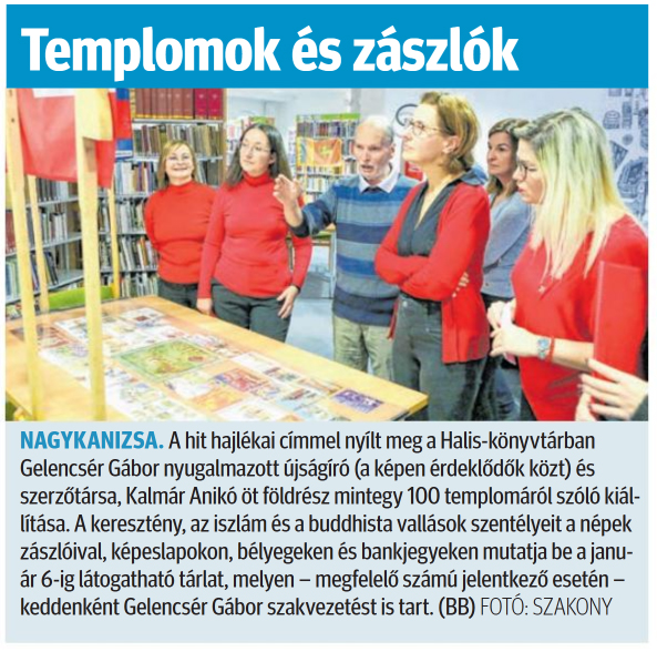Nyilvános 631 | 816 | Zalai Hírlap 2024. december 4. 282. szám 3. oldal | Templomok és zászlók NAGYKANIZSA. A hit hajlékai címmel nyílt meg a Halis-könyvtárban Gelencsér Gábor nyugalmazott újságíró (a képen érdeklődők közt) és szerzőtársa, Kalmár Anikó öt földrész mintegy 100 templomáról szóló kiállítása. A keresztény, az iszlám és a buddhista vallások szentélyeit a népek zászlóival, képeslapokon, bélyegeken és bankjegyeken mutatja be a január 6-ig látogatható tárlat, melyen - megfelelő számú jelentkező esetén - keddenként Gelencsér Gábor szakvezetést is tart. (BB) FOTÓ: SZAKONY |