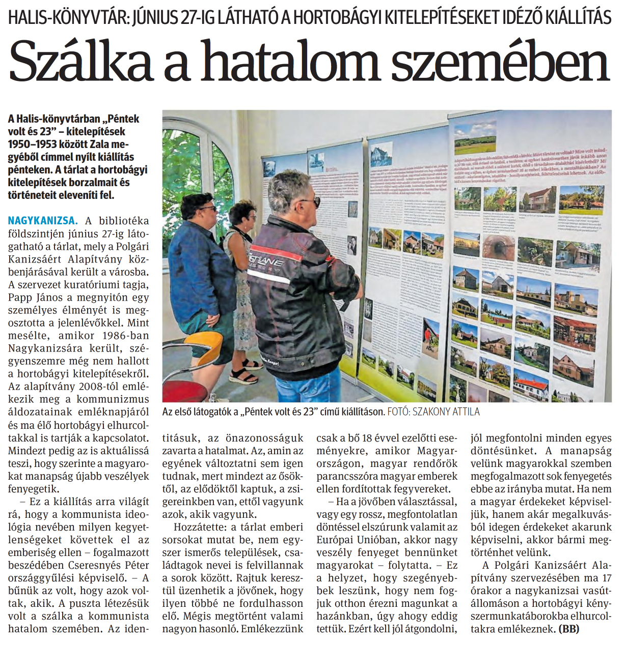 Nyilvános 657 | 1099 | Zalai Hírlap 2025. június 16. 137. szám 3. oldal | HALIS-KÖNYVTÁR: JÚNIUS 27-IG LÁTHATÓ A HORTOBÁGYI KITELEPÍTÉSEKET IDÉZŐ KIÁLLÍTÁS Szálka a hatalom szemében Az első látogatók a „Péntek volt és 23" című kiállításon. FOTÓ: SZAKONY ATTILA A Halis-könyvtárban „Péntek volt és 23" - kitelepítések 1950-1953 között Zala megyéből címmel nyílt kiállítás pénteken. A tárlat a hortobágyi kitelepítések borzalmait és történeteit eleveníti fel. NAGYKANIZSA. A bibliotéka földszintjén június 27-ig látogatható a tárlat, mely a Polgári Kanizsáért Alapítvány közbenjárásával került a városba. A szervezet kuratóriumi tagja, Papp János a megnyitón egy személyes élményét is megosztotta a jelenlévőkkel. Mint mesélte, amikor 1986-ban Nagykanizsára került, szégyenszemre még nem hallott a hortobágyi kitelepítésekről. Az alapítvány 2008-tól emlékezik meg a kommunizmus áldozatainak emléknapjáról és ma élő hortobágyi elhurcol-takkal is tartják a kapcsolatot. Mindezt pedig az is aktuálissá teszi, hogy szerinte a magyarokat manapság újabb veszélyek fenyegetik. - Ez a kiállítás arra világít rá, hogy a kommunista ideológia nevében milyen kegyetlenségeket követtek el az emberiség ellen - fogalmazott beszédében Cseresnyés Péter országgyűlési képviselő. - A bűnük az volt, hogy azok voltak, akik. A puszta létezésük volt a szálka a kommunista hatalom szemében. Az identitásuk, az önazonosságuk zavarta a hatalmat. Az, amin az egyének változtatni sem igen tudnak, mert mindezt az ősöktől, az elődöktől kaptuk, a zsigereinkben van, ettől vagyunk azok, akik vagyunk. Hozzátette: a tárlat emberi sorsokat mutat be, nem egyszer ismerős települések, családtagok nevei is felvillannak a sorok között. Rajtuk keresztül üzenhetik a jövőnek, hogy ilyen többé ne fordulhasson elő. Mégis megtörtént valami nagyon hasonló. Emlékezzünk csak a bő 18 évvel ezelőtti eseményekre, amikor Magyarországon, magyar rendőrök parancsszóra magyar emberek ellen fordítottak fegyvereket. - Ha a jövőben választással, vagy egy rossz, megfontolatlan döntéssel elszúrunk valamit az Európai Unióban, akkor nagy veszély fenyeget bennünket magyarokat - folytatta. - Ez a helyzet, hogy szegényebbek leszünk, hogy nem fogjuk otthon érezni magunkat a hazánkban, úgy ahogy eddig tettük. Ezért kell jól átgondolni, jól megfontolni minden egyes döntésünket. A manapság velünk magyarokkal szemben megfogalmazott sok fenyegetés ebbe az irányba mutat. Ha nem a magyar érdekeket képviseljük, hanem akár megalkuvásból idegen érdekeket akarunk képviselni, akkor bármi megtörténhet velünk. A Polgári Kanizsáért Alapítvány szervezésében ma 17 órakor a nagykanizsai vasútállomáson a hortobágyi kényszermunkatáborokba elhurcol-takra emlékeznek. (BB) |