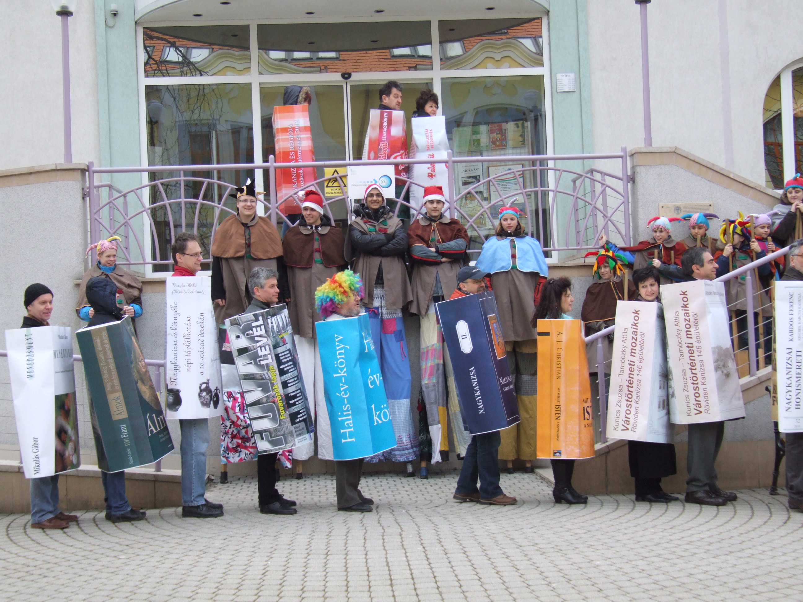 Nyilvános 1152 | 2634 | 2013. február 9. A farsangi fánkfesztiválra készülve felhívásban kértük olvasóinkat, hogy öltsék magukra kedves könyvüket. Egy „könyvespolcnyi” jelentkező vette magára kedves olvasmányát, az ő vonulásukról készültek ezek a képek. A környezetükben néhol láthatók a Nagykanizsai Gólyalábasok, akik szintén a könyvtárhoz kötődnek. A „felvonuló kötetek” a könyvtár épületében még megtekinthetők. | |