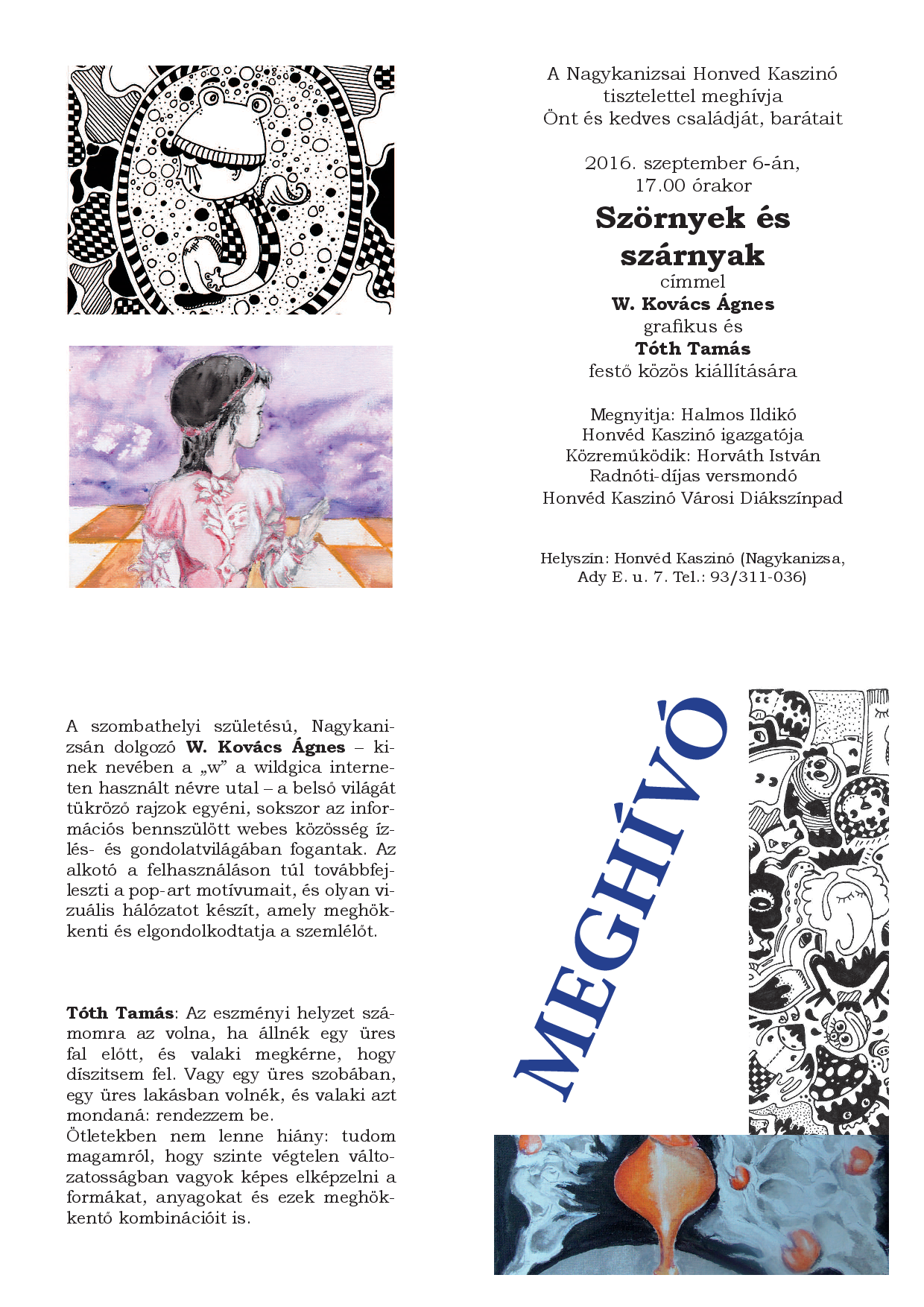 Nyilvános 891 | 1647 | MEGHÍVÓ | A szombathelyi születésű, Nagykanizsán dolgozó W. Kovács Ágnes – kinek nevében a „w” a wildgica interneten használt névre utal – a belső világát tükröző rajzok egyéni, sokszor az információs bennszülött webes közösség ízlés- és gondolatvilágában fogantak. Az alkotó a felhasználáson túl továbbfejleszti a pop-art motívumait, és olyan vizuális hálózatot készít, amely meghökkenti és elgondolkodtatja a szemlélőt. Tóth Tamás: Az eszményi helyzet számomra az volna, ha állnék egy üres fal előtt, és valaki megkérne, hogy díszitsem fel. Vagy egy üres szobában, egy üres lakásban volnék, és valaki azt mondaná: rendezzem be. Ötletekben nem lenne hiány: tudom magamról, hogy szinte végtelen változatosságban vagyok képes elképzelni a formákat, anyagokat és ezek meghökkentő kombinációit is. A Nagykanizsai Honved Kaszinó tisztelettel meghívja Önt és kedves családját, barátait 2016. szeptember 6-án, 17.00 órakor Szörnyek és szárnyak címmel W. Kovács Ágnes grafikus és Tóth Tamás festő közös kiállítására Megnyitja: Halmos Ildikó Honvéd Kaszinó igazgatója Közreműködik: Horváth István Radnóti-díjas versmondó Honvéd Kaszinó Városi Diákszínpad Helyszín: Honvéd Kaszinó (Nagykanizsa, Ady E. u. 7. Tel.: 93/311-036) |