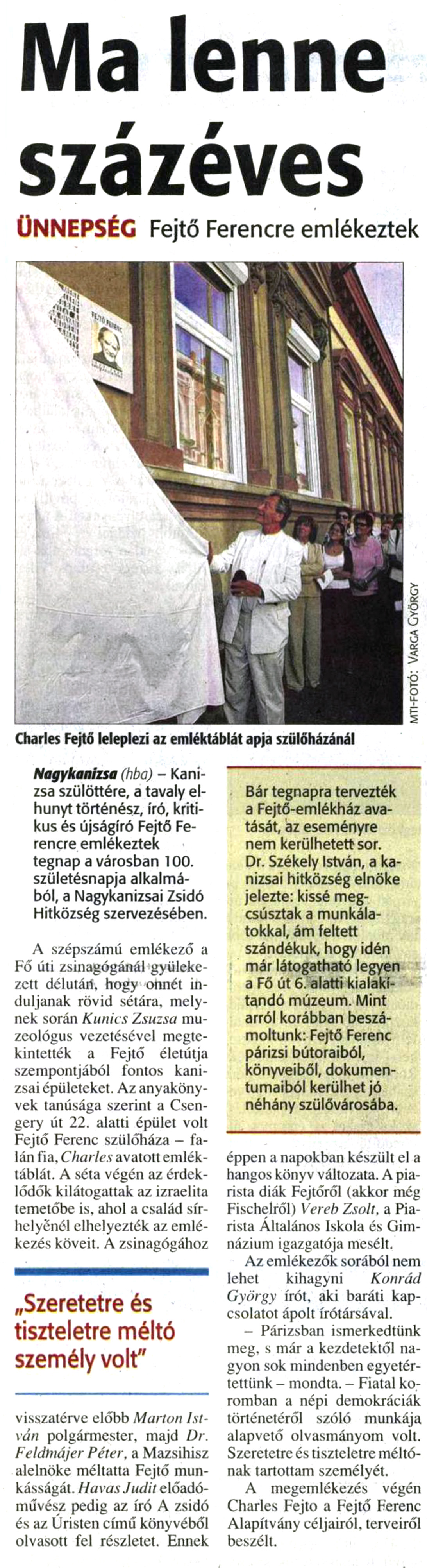 Nyilvános 729 | 1053 | Zalai Hírlap 2009. augusztus 31. 5. oldal | Ma lenne százéves ÜNNEPSÉG Fejtő Ferencre emlékeztek Bár tegnapra tervezték a Fejtő-emlékház avatását, az eseményre nem kerülhetett sor. Dr. Székely István, a kanizsai hitközség elnöke jelezte: kissé megcsúsztak a munkálatokkal, ám feltett szándékuk, hogy idén már látogatható legyen a Fő út 6. alatti kialakítandó múzeum. Mint arról korábban beszámoltunk: Fejtő Ferenc párizsi bútoraiból, könyveiből, dokumentumaiból kerülhet jó néhány szülővárosába. Nagykanizsa (hba) - Kanizsa szülöttére, a tavaly elhunyt történész, író, kritikus és újságíró Fejtő Ferencre emlékeztek tegnap a városban 100. születésnapja alkalmából, a Nagykanizsai Zsidó Hitközség szervezésében. A szépszámú emlékező a Fő úti zsinagógánál gyülekezett délutárí, hogy onnét induljanak rövid sétára, melynek során Kunics Zsuzsa muzeológus vezetésével megtekintették a Fejtő életútja szempontjából fontos kanizsai épületeket. Az anyakönyvek tanúsága szerint a Csen- gery út 22. alatti épület volt Fejtő Ferenc szülőháza - falán fia, Charles avatott emléktáblát. A séta végén az érdeklődők kilátogattak az izraelita temetőbe is, ahol a család sírhelyénél elhelyezték az emlékezés köveit. A zsinagógához visszatérve előbb Marton István polgármester, majd Dr. Feldtnájer Péter, a Mazsihisz alelnöke méltatta Fejtő munkásságát. Havas Judité lőadó- művész pedig az író A zsidó és az Úristen című könyvéből olvasott fel részletet. Ennek éppen a napokban készült el a hangos könyv változata. A piarista diák Fejtőről (akkor még Fischelről) Vereb Zsolt, a Piarista Általános Iskola és Gimnázium igazgatója mesélt. Az emlékezők sorából nem lehet kihagyni Konrád György írót, aki baráti kapcsolatot ápolt írótársával. - Párizsban ismerkedtünk meg, s már a kezdetektől nagyon sok mindenben egyetértettünk- mondta. - Fiatal koromban a népi demokráciák történetéről szóló munkája alapvető olvasmányom volt. Szeretetre és tiszteletre méltónak tartottam személyét. A megemlékezés végén Charles Fejtő a Fejtő Ferenc Alapítvány céljairól, terveiről beszélt. Charles Fejtő leleplezi az emléktáblát apja szülőházánál |