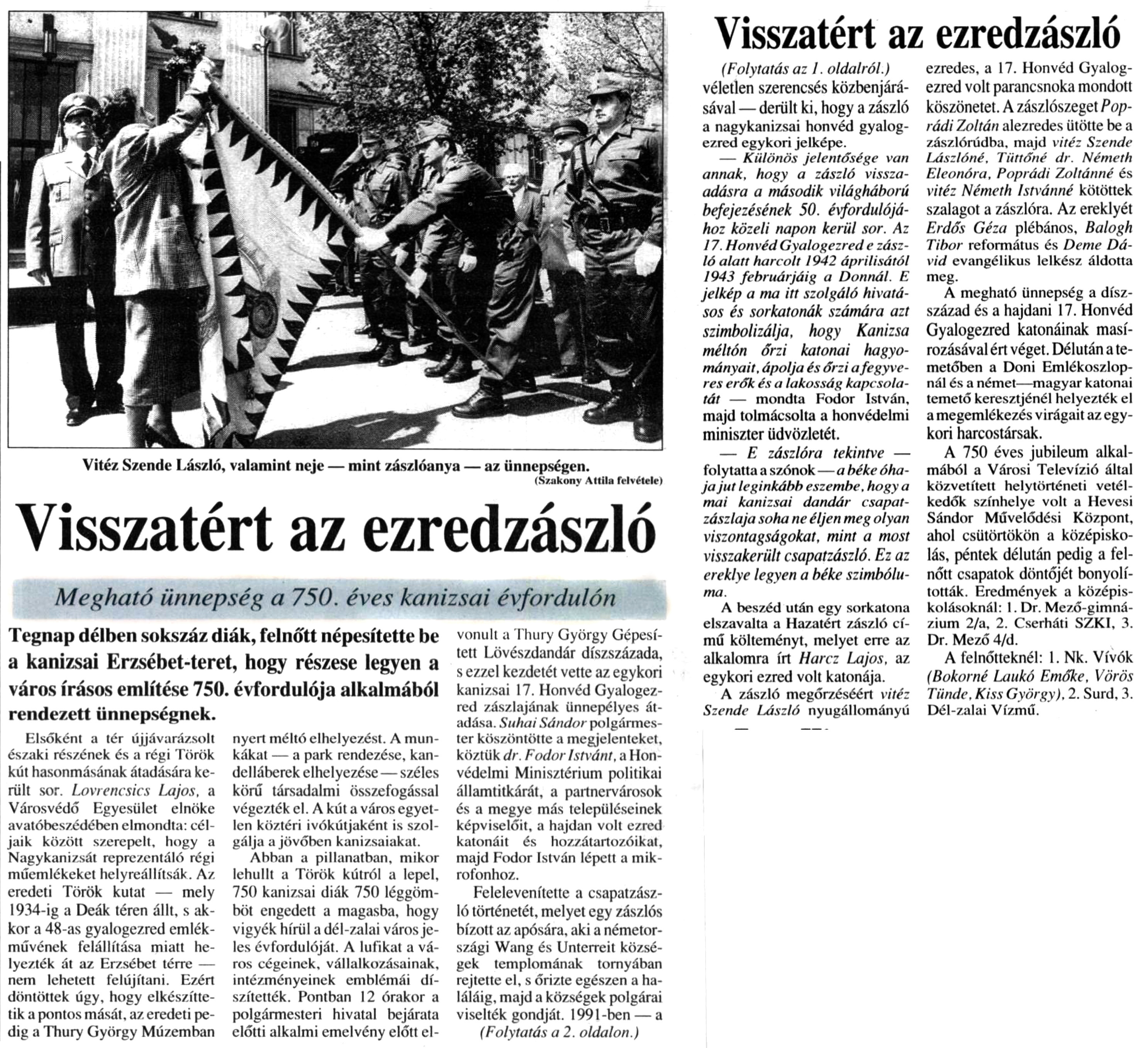 Nyilvános 756 | 1139 | Zalai Hírlap 1995. április 22. 94. szám 1, 2. oldal | Visszatért az ezredzászló Megható ünnepség a 750. éves kanizsai évfordulón Vitéz Szende László, valamint neje — mint zászlóanya — az ünnepségen. (Szakony Attila felvétele) Tegnap délben sokszáz diák, felnőtt népesítette be a kanizsai Erzsébet-teret, hogy részese legyen a város írásos említése 750. évfordulója alkalmából rendezett ünnepségnek. Elsőként a tér újjávarázsolt északi részének és a régi Török kút hasonmásának átadására került sor. Lovrencsics Lajos, a Városvédő Egyesület elnöke avatóbeszédében elmondta: céljaik között szerepelt, hogy a Nagykanizsát reprezentáló régi műemlékeket helyreállítsák. Az eredeti Török kutat — mely 1934-ig a Deák téren állt, s akkor a 48-as gyalogezred emlékművének felállítása miatt helyezték át az Erzsébet térre — nem lehetett felújítani. Ezért döntöttek úgy, hogy elkészíttetik a pontos mását, az eredeti pedig a Thury György Múzemban nyert méltó elhelyezést. A munkákat — a park rendezése, kandeláberek elhelyezése—széles körű társadalmi összefogással végezték el. A kút a város egyetlen köztéri ivókútjaként is szolgálja a jövőben kanizsaiakat. Abban a pillanatban, mikor lehullt a Török kútról a lepel, 750 kanizsai diák 750 léggömböt engedett a magasba, hogy vigyék hírül a dél-zalai város jeles évfordulóját. A lufikat a város cégeinek, vállalkozásainak, intézményeinek emblémái díszítették. Pontban 12 órakor a polgármesteri hivatal bejárata előtti alkalmi emelvény előtt elvonult a Thury György Gépesített Lövészdandár díszszázada, s ezzel kezdetét vette az egykori kanizsai 17. Honvéd Gyalogezred zászlajának ünnepélyes átadása. Suhai Sándor polgármester köszöntötte a megjelenteket, köztük dr. Fodor Istvánt, a Honvédelmi Minisztérium politikai államtitkárát, a partnervárosok és a megye más településeinek képviselőit, a hajdan volt ezred katonáit és hozzátartozóikat, majd Fodor István lépett a mikrofonhoz. Felelevenítette a csapatzászló történetét, melyet egy zászlós bízott az apósára, aki a németországi Wang és Unterreit községek templomának tornyában rejtette el, s őrizte egészen a haláláig, majd a községek polgárai viselték gondját. 1991-ben — a (Folytatás a 2. oldalon.) Visszatért az ezredzászló (Folytatás az 1. oldalról.) véletlen szerencsés közbenjárásával — derült ki, hogy a zászló a nagykanizsai honvéd gyalogezred egykori jelképe. — Különös jelentősége van annak, hogy a zászló visszaadásra a második világháború befejezésének 50. évfordulójához közeli napon kerül sor. Az 17. Honvéd Gyalogezred e zászló alatt harcolt 1942 áprilisától 1943 februárjáig a Donnál. E jelkép a ma itt szolgáló hivatásos és sorkatonák számára azt szimbolizálja, hogy Kanizsa méltón őrzi katonai hagyományait. ápolja és őrzi a fegyveres ereik és a lakosság kapcsolatát — mondta Fodor István, majd tolmácsolta a honvédelmi miniszter üdvözletét. — E zászlóra tekintve — folytatta a szónok — a béke óhaja jut leginkább eszembe, hogy a mai kanizsai dandár csapatzászlaja soha ne éljen meg olyan viszontagságokat, mint a most visszakerült csapatzászló. Ez az ereklye legyen a béke szimbóluma. A beszéd után egy sorkatona elszavalta a Hazatért zászló című költeményt, melyet erre az alkalomra írt Harcz Lajos, az egykori ezred volt katonája. A zászló megőrzéséért vitéz Szende László nyugállományú ezredes, a 17. Honvéd Gyalogezred volt parancsnoka mondott köszönetét. A zászlószeget Poprádi Zoltán alezredes ütötte be a zászlórúdba, majd vitéz Szende Lászlóné, Tüttőné dr. Németh Eleonóra, Poprádi Zoltánné és vitéz Németh Istvánné kötöttek szalagot a zászlóra. Az ereklyét Erdős Géza plébános, Balogh Tibor református és Deme Dávid evangélikus lelkész áldotta meg. A megható ünnepség a díszszázad és a hajdani 17. Honvéd Gyalogezred katonáinak masírozásával ért véget. Délután a temetőben a Doni Emlékoszlopnál és a német—magyar katonai temető keresztjénél helyezték el a megemlékezés virágait az egykori harcostársak. A 750 éves jubileum alkalmából a Városi Televízió által közvetített helytörténeti vetélkedők színhelye volt a Hevesi Sándor Művelődési Központ, ahol csütörtökön a középiskolás, péntek délután pedig a felnőtt csapatok döntőjét bonyolították. Eredmények a középiskolásoknál: 1. Dr. Mező-gimnázium 2/a, 2. Cserháti SZKI, 3. Dr. Mező 4/d. A felnőtteknél: 1. Nk. Vívók (Bokomé Laukó Emőke, Vörös Tünde, Kiss György), 2. Surd, 3. Dél-zalai Vízmű. |