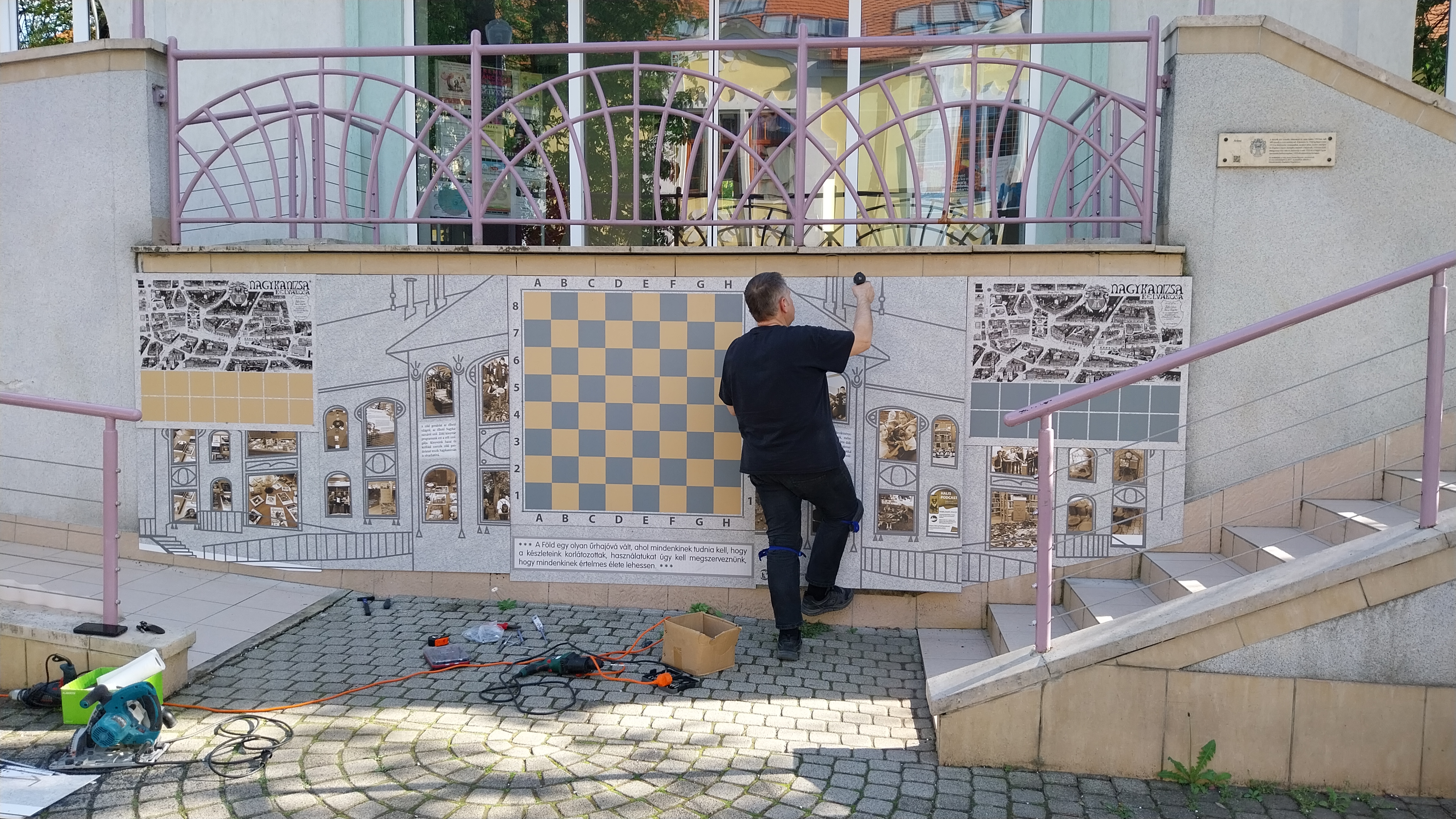 2024.04.04. Jane Goodall freskó felszerelése a könyvtár elejére